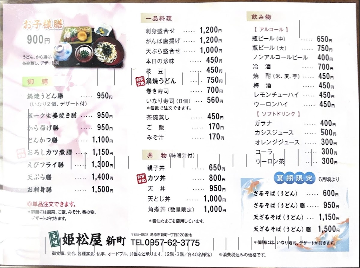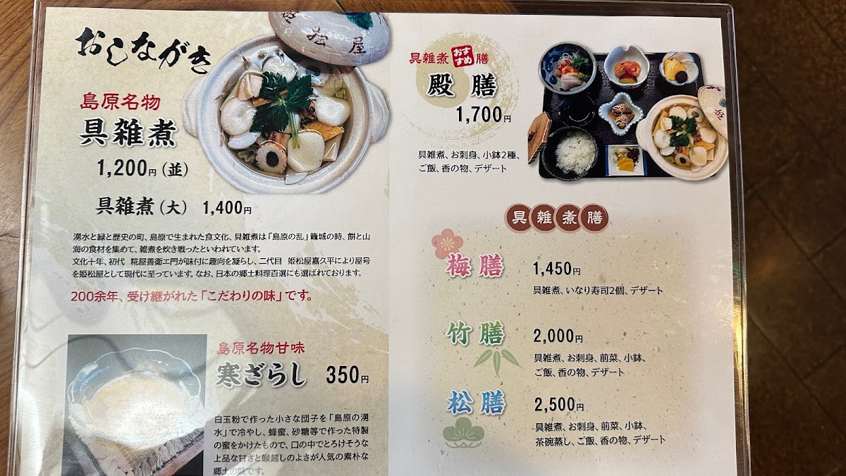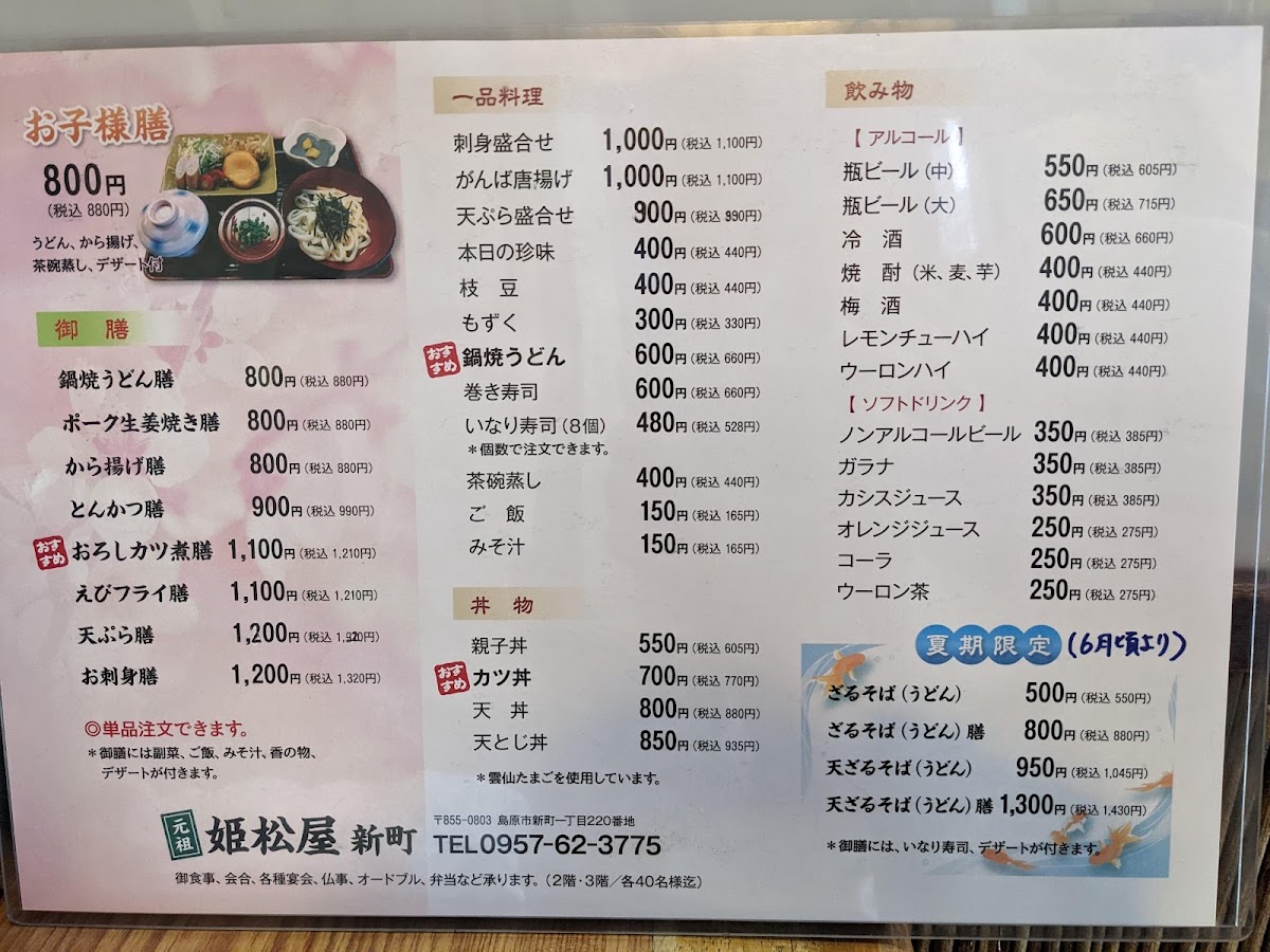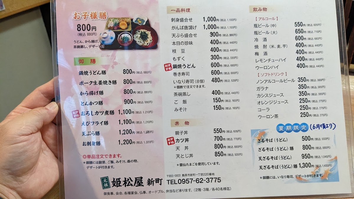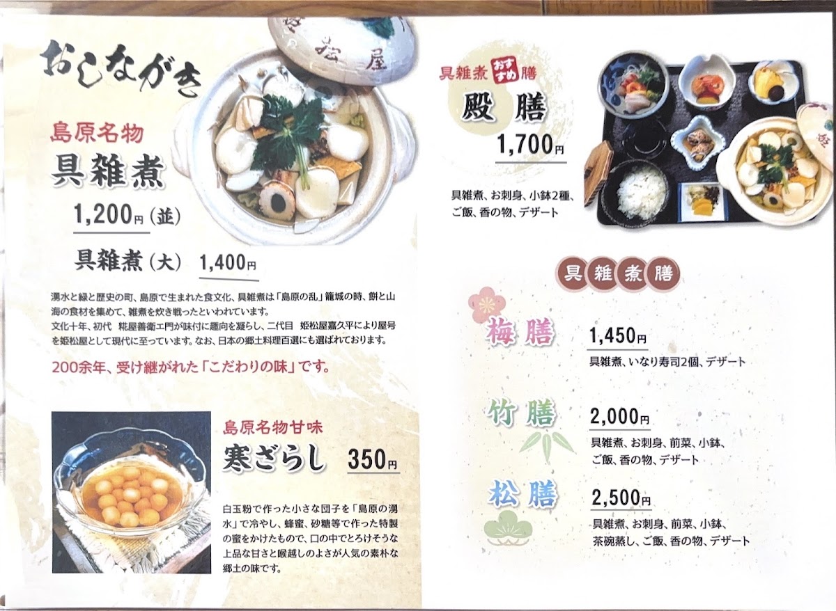 The menu at Himematsuya Shinmachi offers a delightful selection of traditional Japanese dishes that cater to a variety of tastes, making it a perfect spot for those craving authentic flavors. Among the standout options is the 具雑煮 大 いなり, a hearty and flavorful dish, ideal for anyone looking for a filling meal. The カツ丼 is another popular choice, combining tender pork cutlet with a savory egg and sauce atop a bowl of rice, creating a satisfying and classic Japanese comfort food.